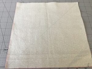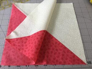 - Using one assorted colored and one background 10″ squares put right sides together. Draw a diagonal line and sew 1/4″ seam on both sides of the line as shown. Cut on the line. Open and press to the dark side. Trim to 9 1/2″ square. Mark, sew and cut 6 (8) sets. Keep each like color set together.