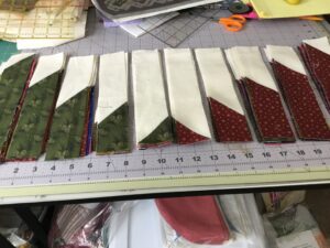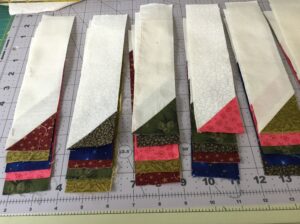 - Cut 4 – 1 7/8″ strips. Do not cut/trim the last one, it will measure about 2″. Open and separate into right and left strip sets. Repeat with the remaining sets stacking like strips together as sown below. (Please excuse the mess under my table.)