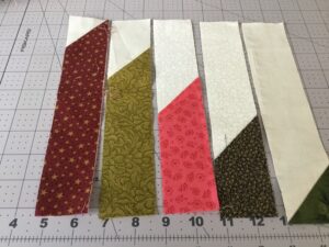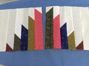 - Working with the right strip group, chose one strip from each pile mixing colors so there are no duplicates. I made piles of each strip set so I didn’t get confused and making sure there were no duplicates. I suppose you could sew each block as you go. Repeat with the left strip group. Sew You should have 6 (8) right blocks and 6 (8) left blocks.