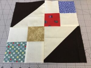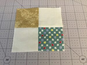 - Using 2 3/4″ assorted colored squares and 2 3/4″ background squares, sew together as shown to make a 4 patch. Press to dark. Should measure 5″ square. Make 48 (56).