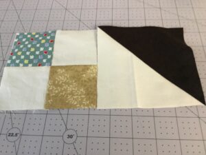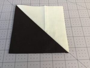 - Using 5 1/2″ background and 5 1/2″ border squares that have been cut on one diagonal to make HST, sew together as shown. Press to dark and trim to 5″. Make 48 (56).